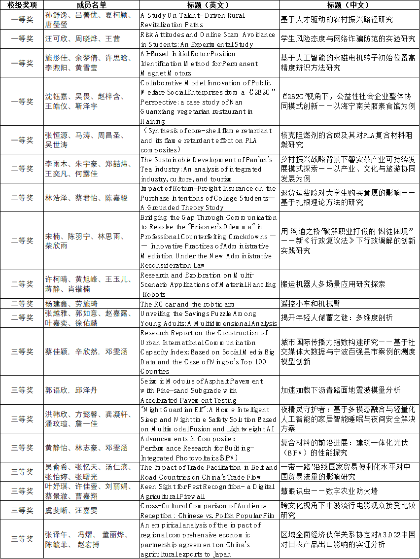 同时,本届比赛还评出校级奖项,包括一等奖5组,二等奖6组和三等奖8组,具体名单如下: